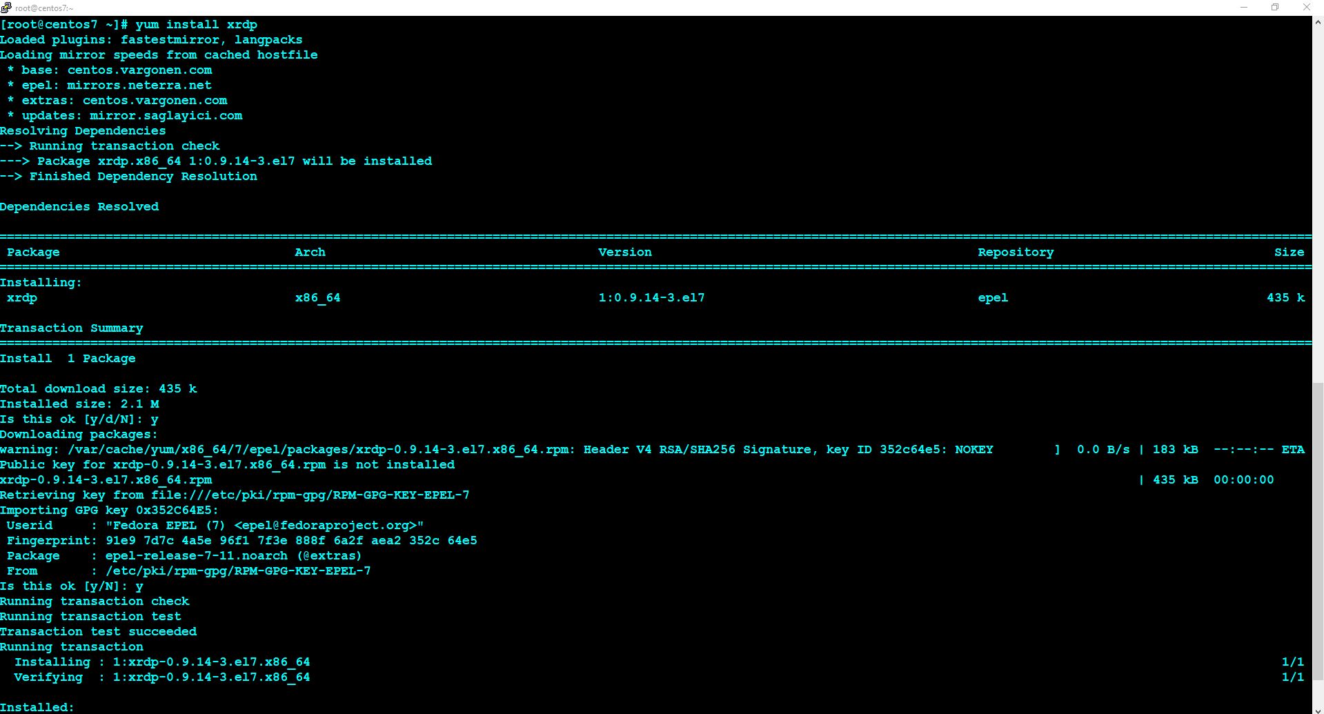 EPEL Deposu ile ilgili gerekli bilgiyi verdikte sonra kurulumuza devam ediyoruz. Xrdp kurmak için aşağıdaki komutu çalıştırıyoruz.