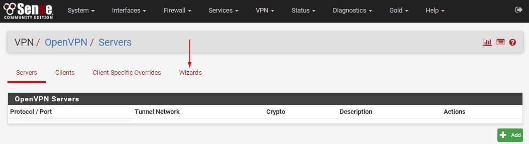 1.İlk olarak VPN -> OpenVPN menüsünü seçiyoruz ve açılan ekranda Wizards modülünü seçerek kurulumu başlatıyoruz.