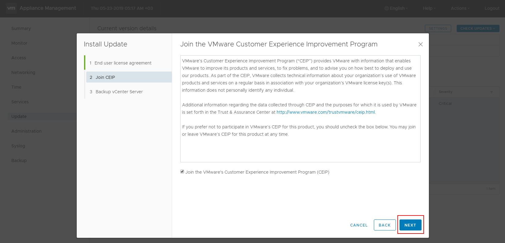 Karşımıza install update menüsü açılıyor burada bize lisans sözleşmesi ve VMware müşteri deneyimleri programına katılmak istiyormusun diye soracaktır. Gerekli bölümleri doldurdukdan sonra Next diyerek devam ediyoruz.