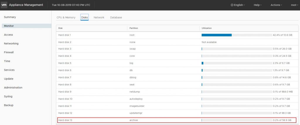 2. Web arayüzünden https://vcenter_fqdn:5480 bağlanarak monitör disk tabından görebiliriz.