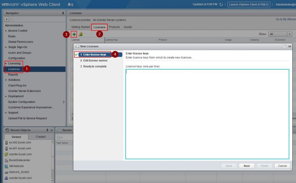Eklemek istediğiniz lisans anahtarlarını girin. Lisans anahtarlarınız yoksa, VMware’den temin edebilirsiniz.